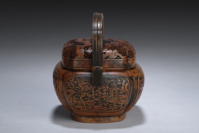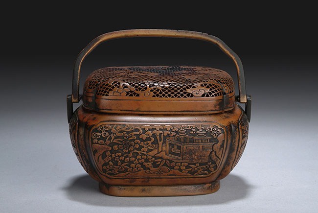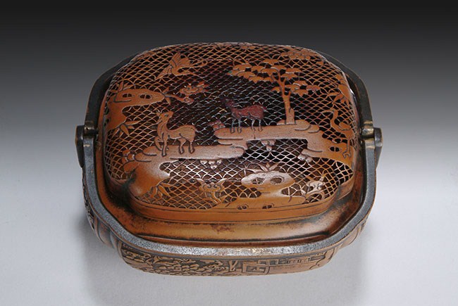 The bronze hand warmer is beautifully made with distinctive decorations all around. A forest scene is carved on the lid that depicts deer and birds. On the sides are different forest scenes. A Chinese marking can be found on the bottom. H: 4 1/8 in (10.5cm)