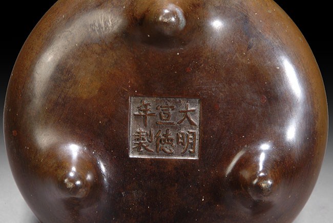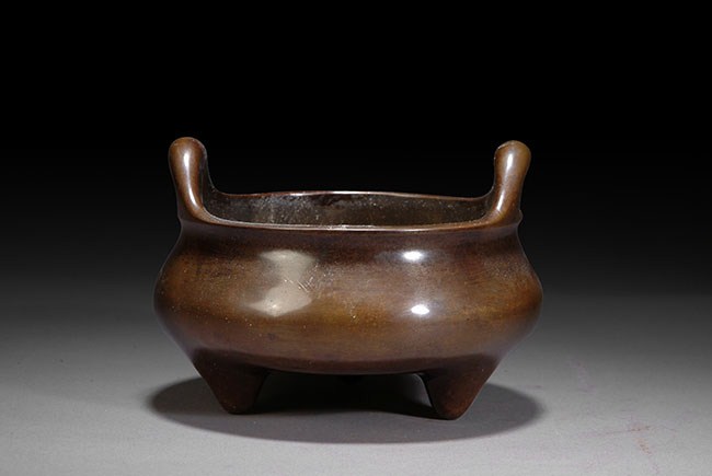 This natural brown censer sits on three small legs with a firm, extruded body. Two handles are located parallel on each side. Mark of "XUANDE" on the bottom. H: 4 3/4 in ( 12 cm), D: 6 in ( 15 cm).