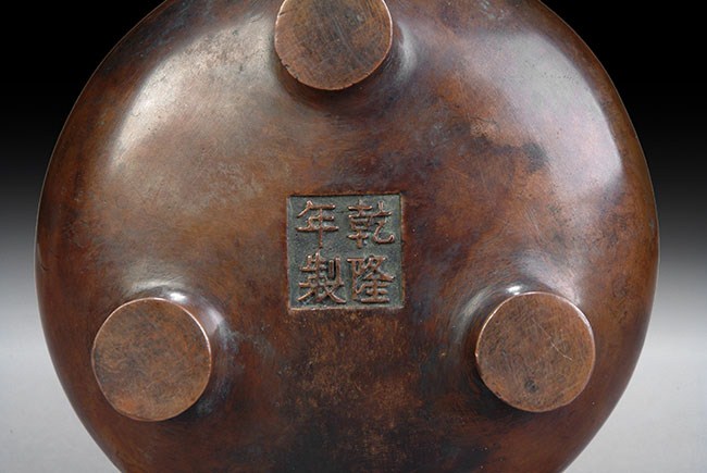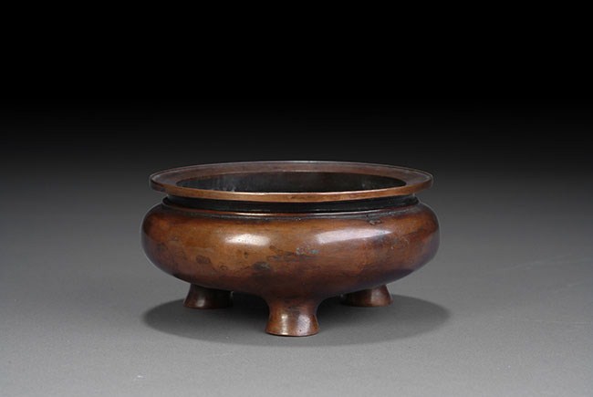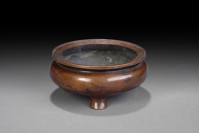 This brown colored censer sits firmly on three legs with a wide body that quickly narrows to the top and extrudes outwards. The censer is perfectly round and has a four letter Chinese marking on the bottom. H: 2 1/4 in (5.5cm), D: 4 3/4in (11cm).