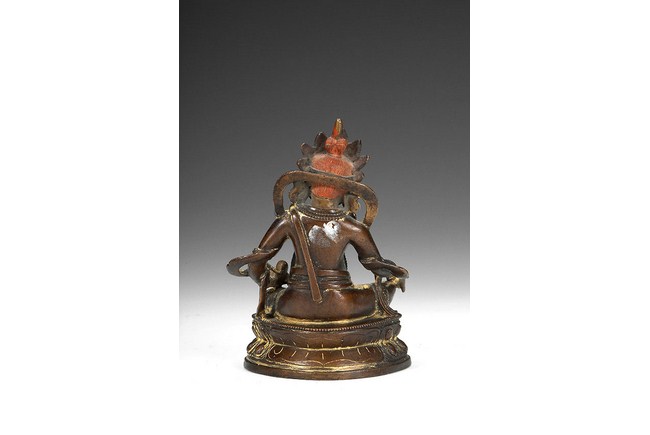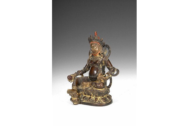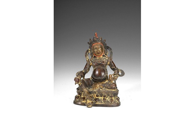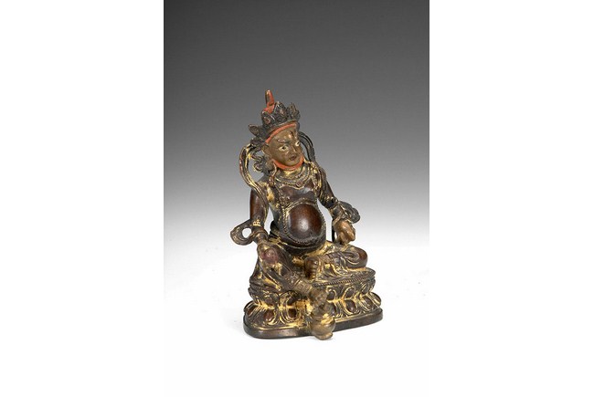 This gilt-bronze Tibetan deity is seated on a raised lotus throne, with one foot stretching out slightly. He is dressed in colorful and ornate clothes, complete with decorated headdress, earrings, necklace, and arm bands. He holds a fruit in one hand, while holding a mouse with another hand. He has an aggressive look, with upwards eyebrows, wide open eyes, and slight smirk. H: 6 1/4 in (16 cm)