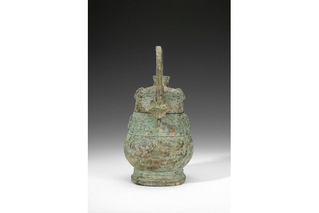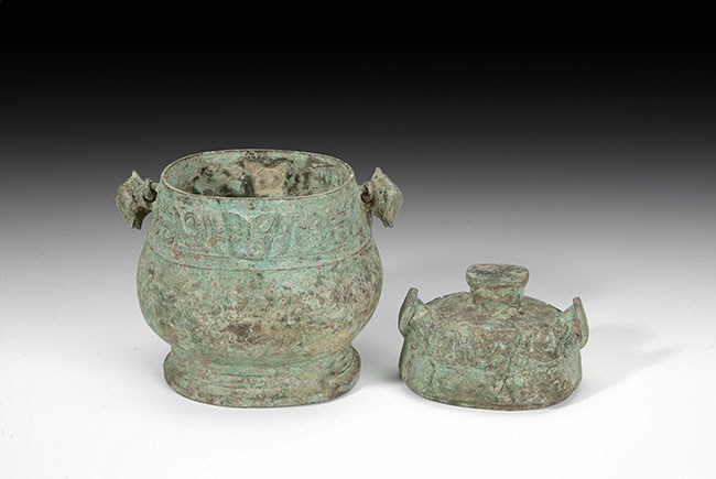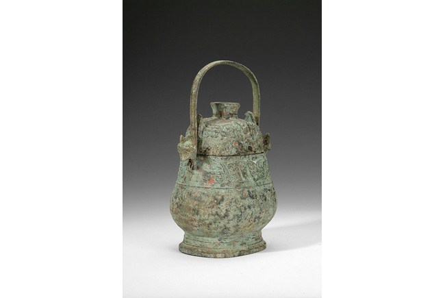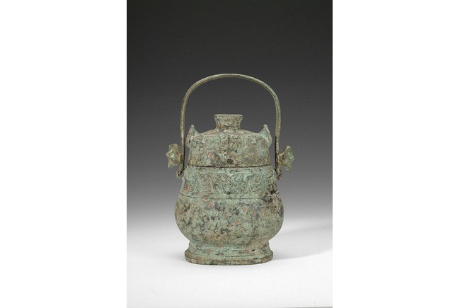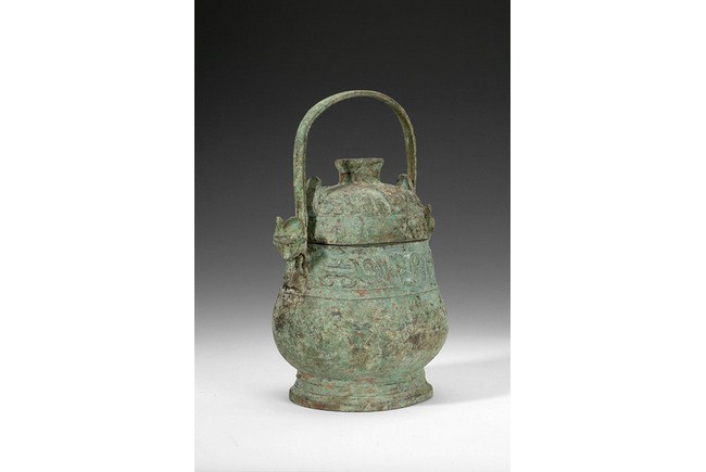 The lidded jar has mythical beast markings on the body, a teapot-like high arching handle, and a lid with rounded rectangular knob. Age related damage, rust, and discoloration. H: 8 1/4 in ( 21.5 cm) bottom W: 5 1/4 in ( 13.5 cm)
