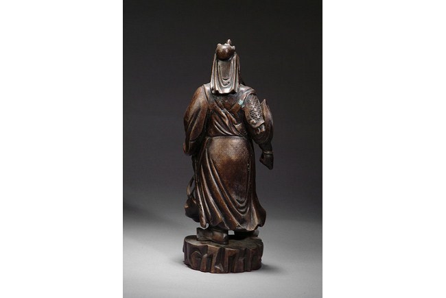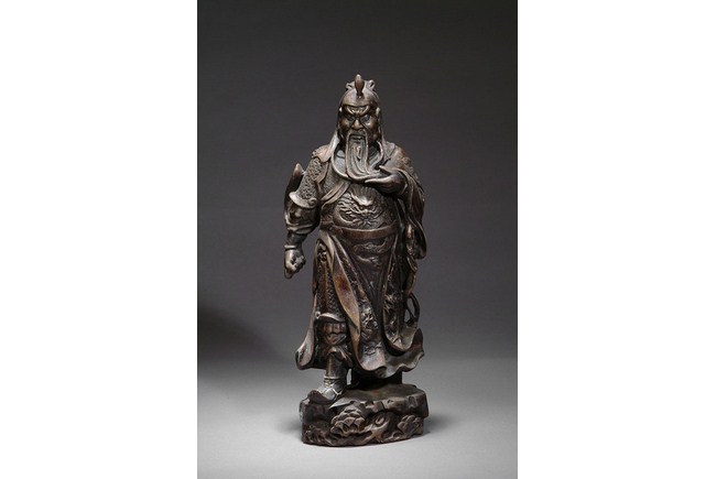 This well casted bronze sculpture depicts the Great Guan in Chinese legend. The Guan is holding his famous long beard with an angry face. He is the symbol of loyalty. H: 15 in ( 38 cm), W: 6 in ( 15 cm).
