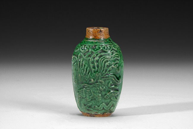 This green glazed snuff bottle depicts mythical creatures on both sides. The stopper is missing. H: 2 3/8 in (6 cm)
