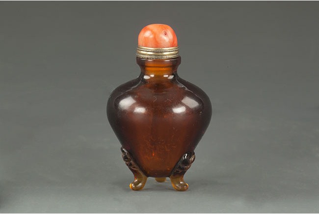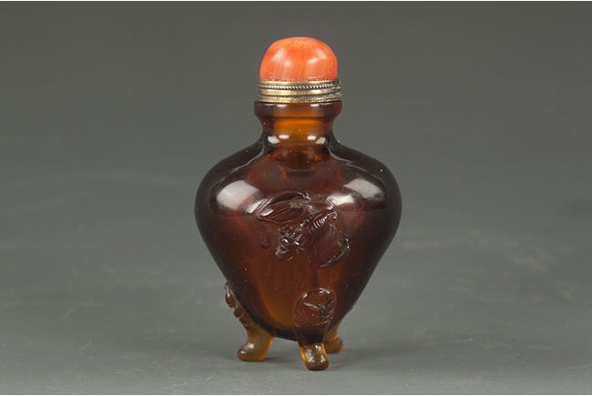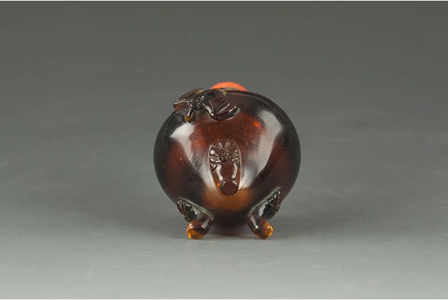 This Peking glass snuff bottle stands on three small Taotie mask themed legs and has an image of a bat. Comes with a coral stopper. H:2 1/2 in (6.5 cm)