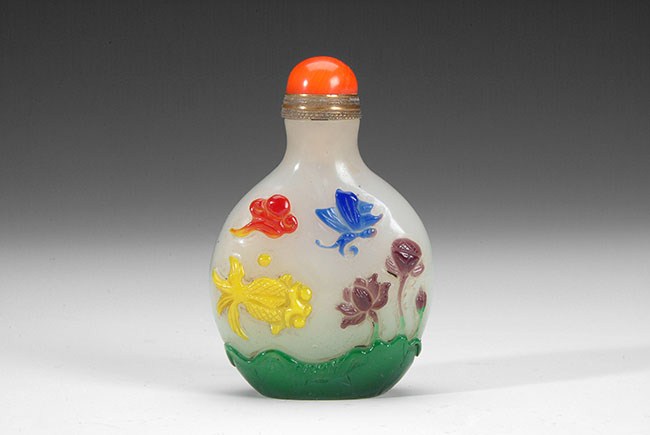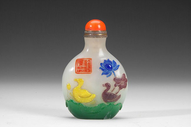 This white snuff bottle is decorated with a pair of ducks on one side and fishes on the other. An artist seal is present on the side of the ducks. Comes with coral stopper. Republic period. H:2.6 in ( 6.5 cm)