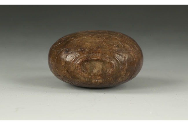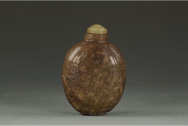 This dark colored jade snuff bottle has carvings of mythical beasts in the front and back. Republic Period. H:2 1/2 in (6.5 cm)