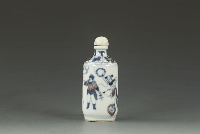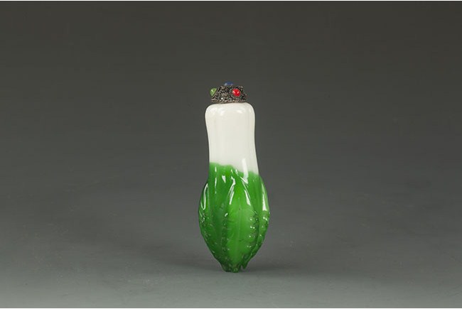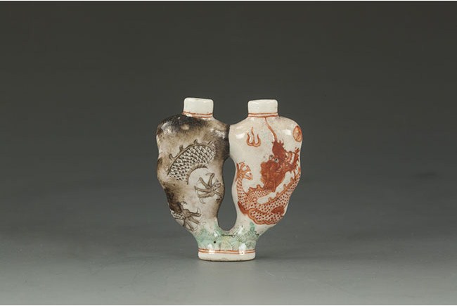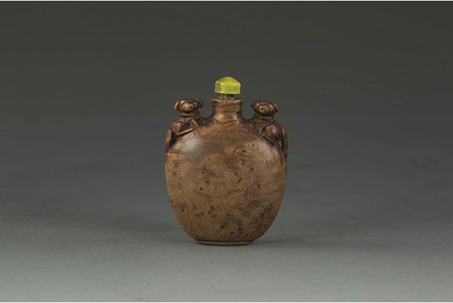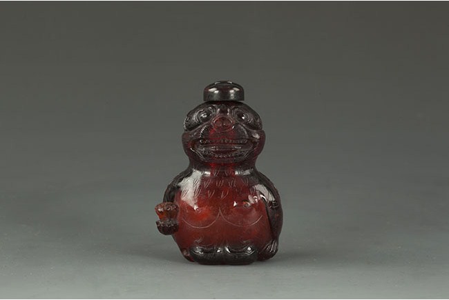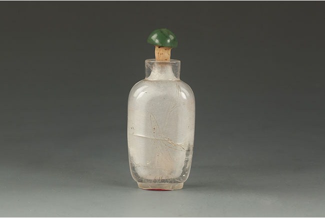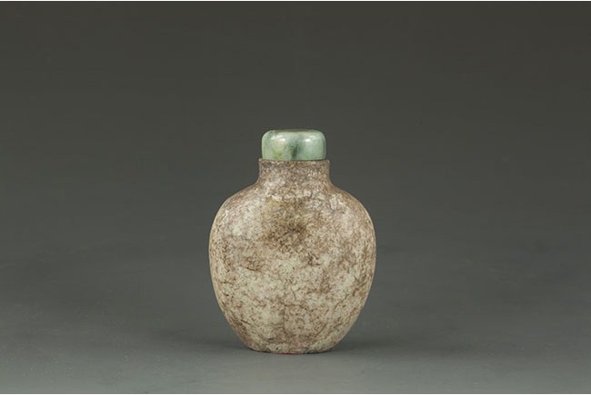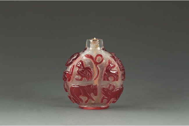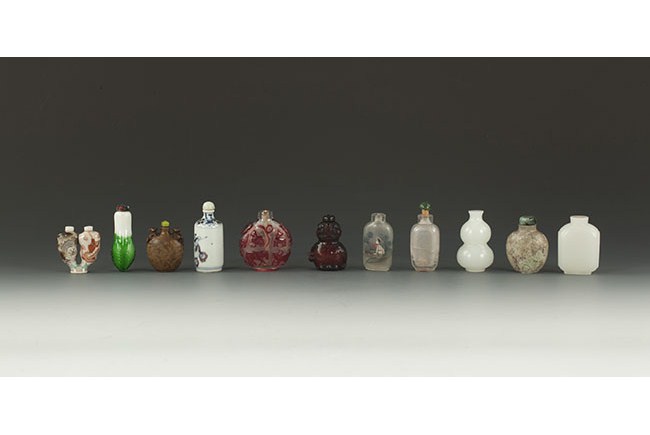 This group of well-carved snuff bottles are made from various materials and have distinctive decorations all around. H: various, W: various