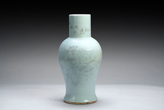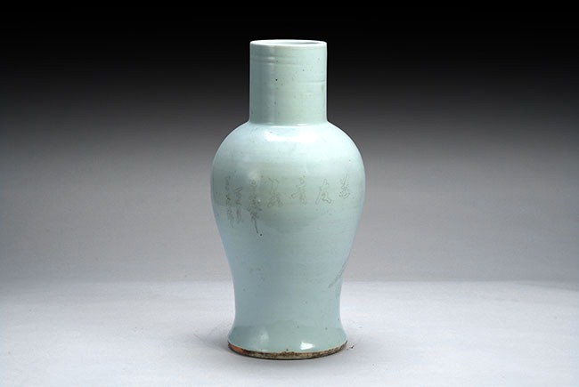 This well-glazed flower vase is a tinted blue color with drawings in the front and Chinese characters in the back. H: 16 in ( 41 cm)
