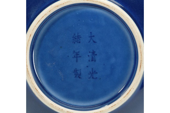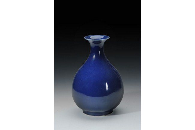 The well glazed blue vase sits on a short base and leads up to a round body. The shoulder narrows into the neck and then widens out to form the mouth. Six Chinese characters are found on the bottom. H: 11 1/2 in (28.3cm)