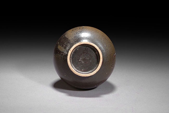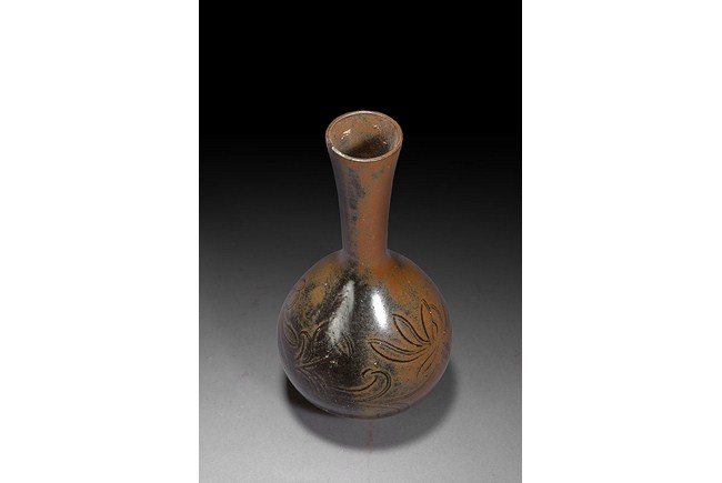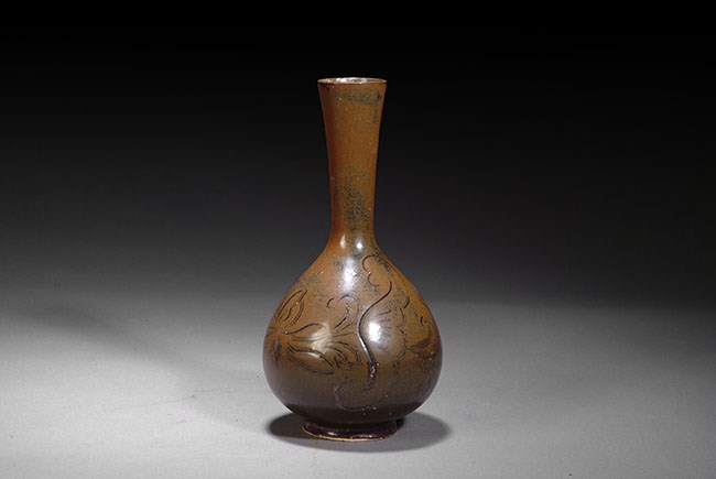 This brown glazed porcelain vase has paintings of chrysanthemum flowers on the body. H: 8 1/2 in (22 cm), D: 5 in (13 cm).