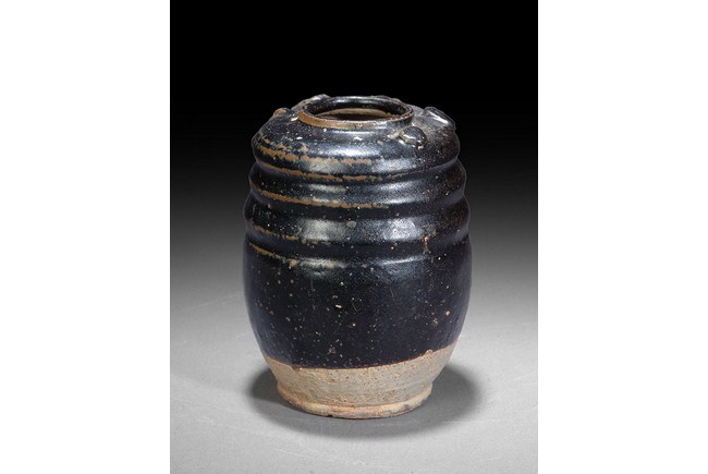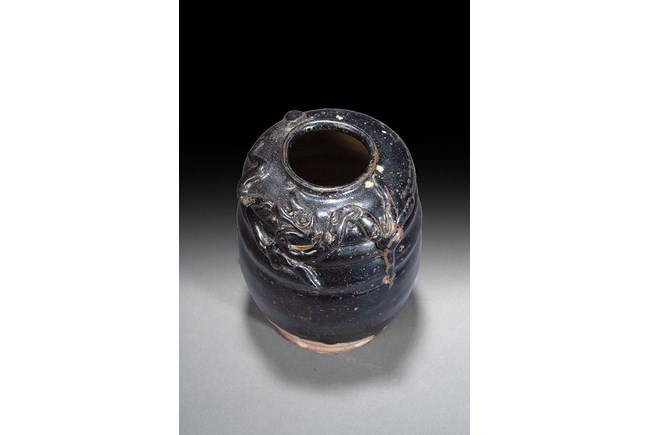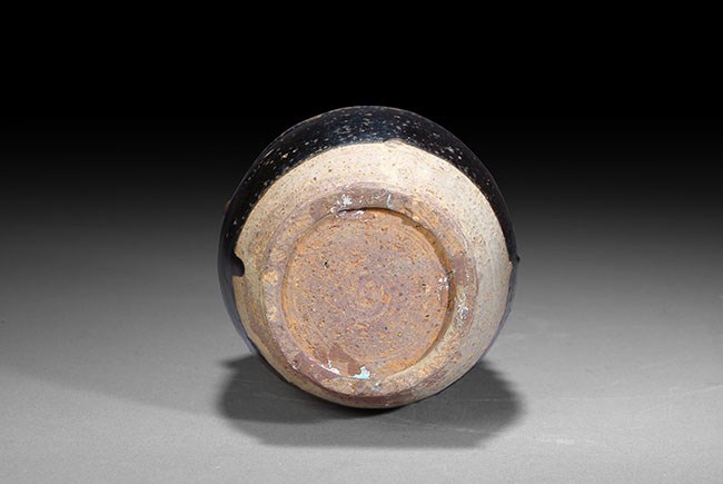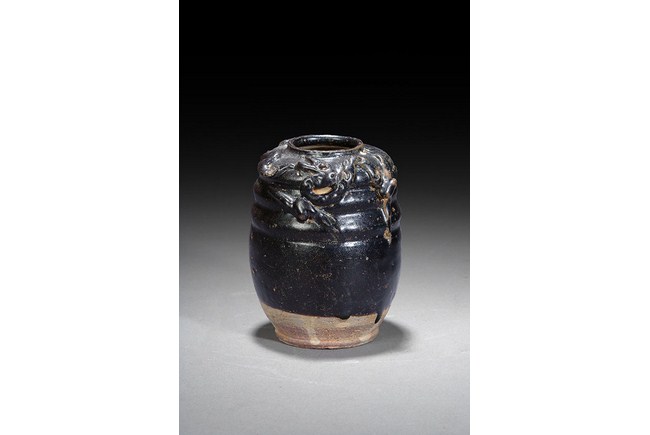 The black glazed vase has a small opening for the mouth and snake-like figures on top. The bottom is unglazed. H: 6 in ( 15 cm), D: 4 1/2 in ( 11 cm).