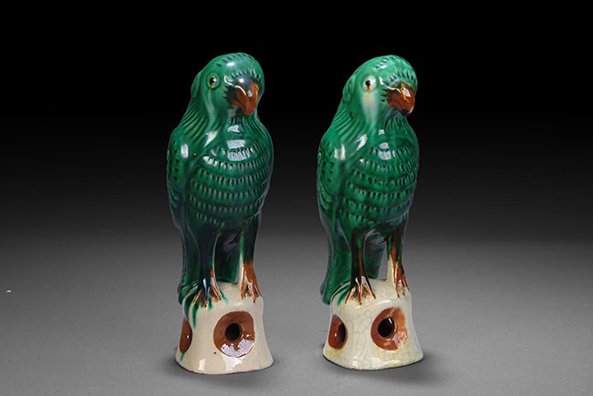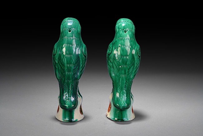 These pair of glazed parrots were standing on top of a rock, looking forward. H: 8 1/4 in ( 21 cm), W: 3 in ( 7.5 cm ).