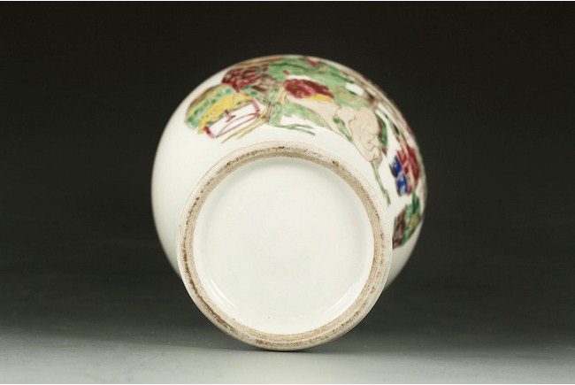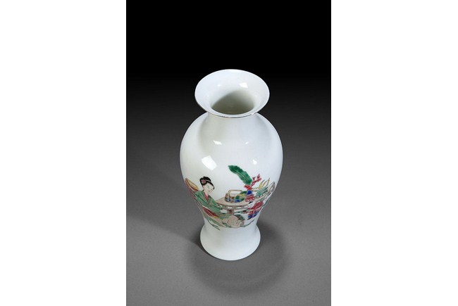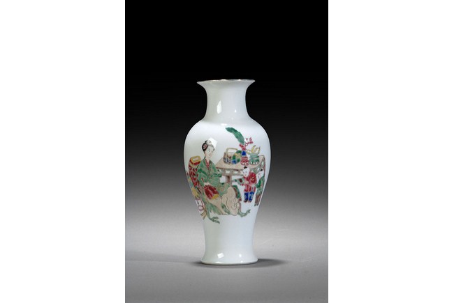 This beautiful famille rose style vase depicts the theme of a lady keeping company with two children when they are studying. H: 8 3/4 in ( 22cm), W: 4 1/4 in ( 11cm).