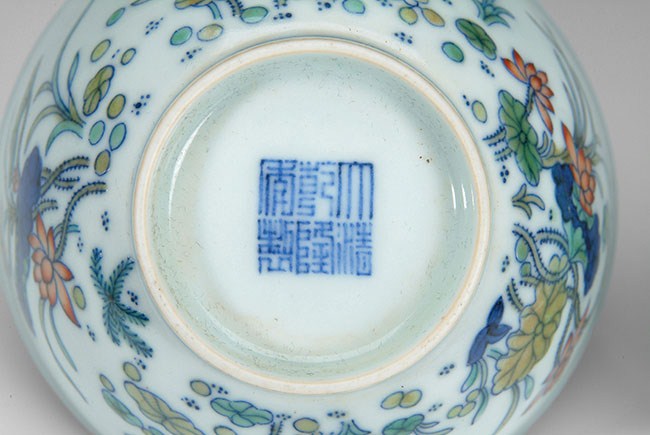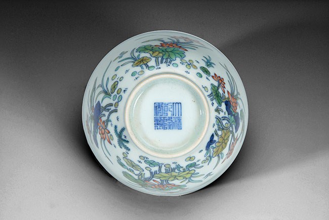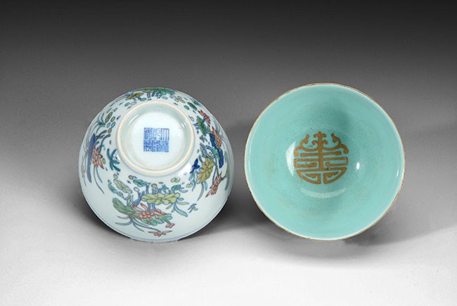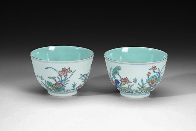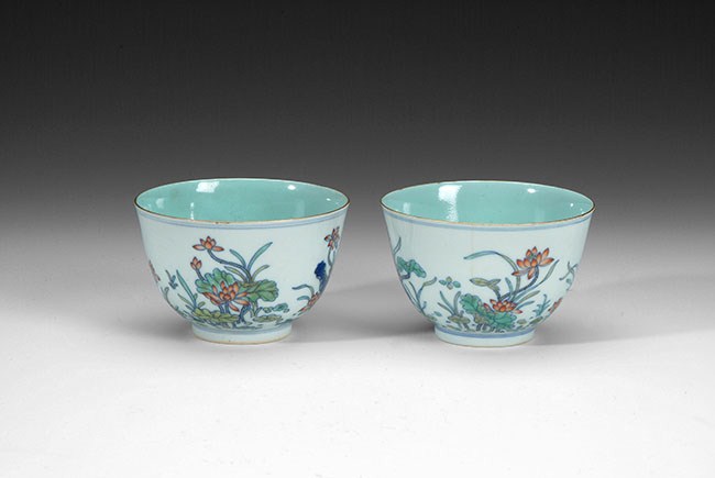 The pair of cups depicts different colored lotus flowers on the outside, teal glaze and Chinese character "Shou" on the inside. Mark of "QIANLONG". One cup has signs of chip and hairline cracks on the outside. H: 2 1/4 in ( 5.5cm), D: 3.5in (9cm).