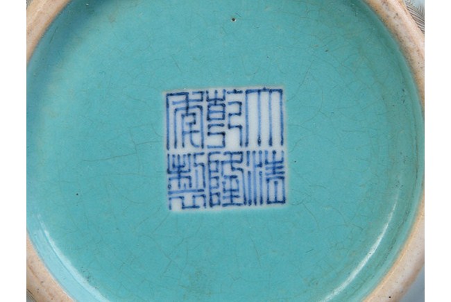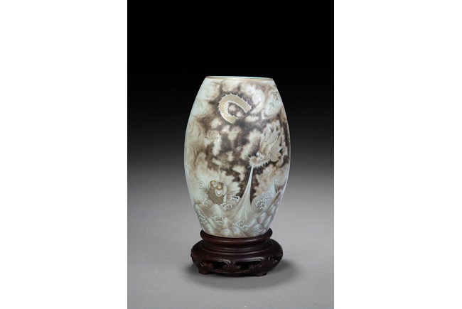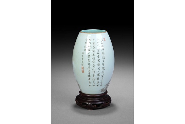 This Chinese olive shaped vase has a painting with dragon and fish scene, with traditional Chinese calligraphy on the surface. Mark of "QIANLONG" at bottom. H: 8 in (20cm), D: 4.5in (11.5cm).