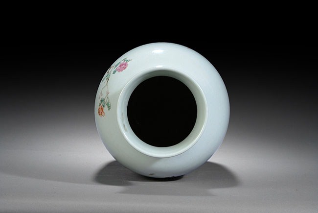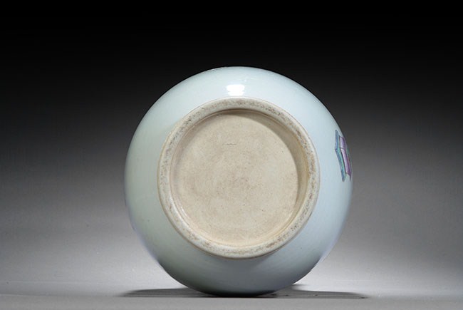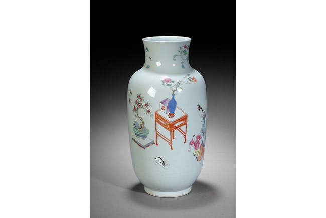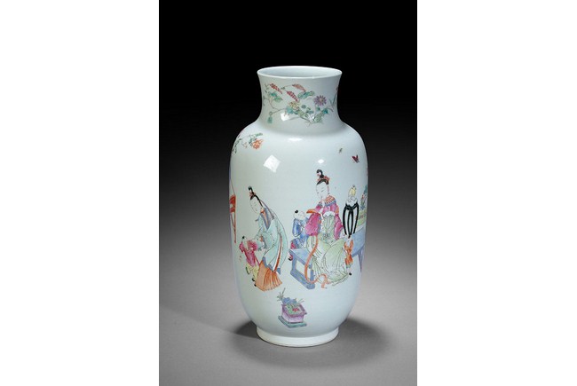 This large vase has a painting of children playing with a dog under the watch of a woman at home. There is also flowers on the shoulder of the vase. H: 17 1/4in ( 44cm), D: 8in (20.5cm).