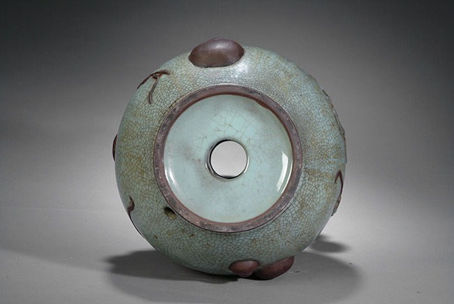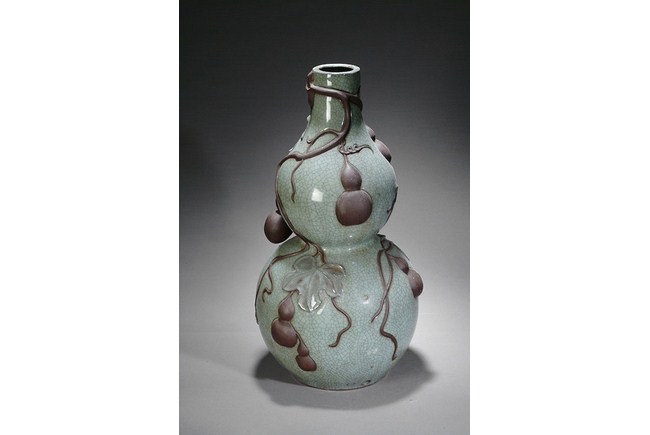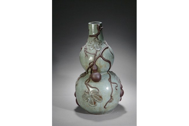 This huge sized gourd shape vase is in the Geyao style, with many smaller gourds decorated on the outside. H: 24 in ( 61 cm), D: 13 in (33cm).