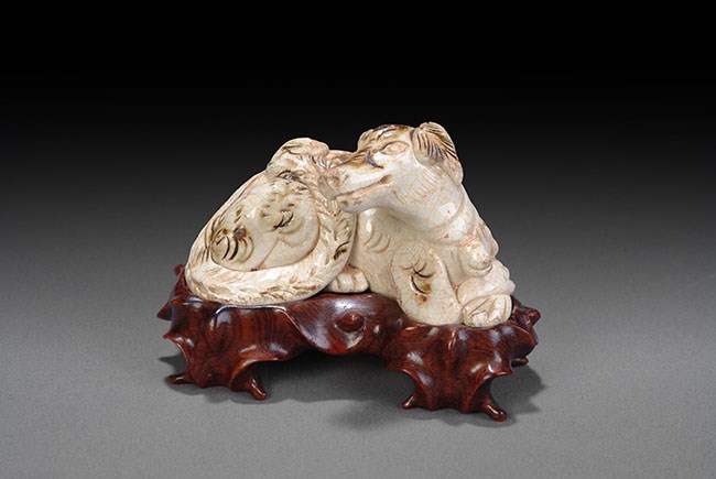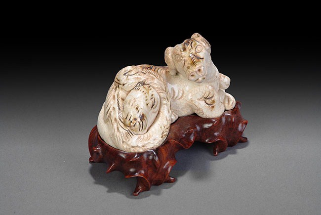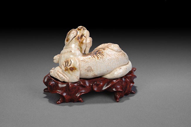 The figure is of a dog laying down and gazing contently towards the side. Its long tail is curled up and wrapped around its body. The figure rests on a beautifully carved four legged wooden stand. H: 3 1/2 in (9cm), W: 5in (13cm).