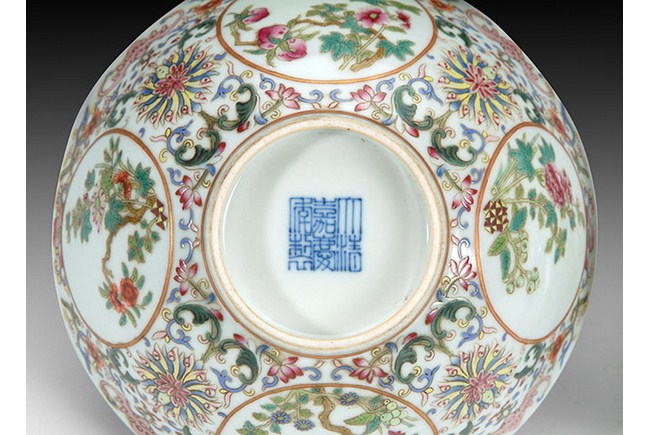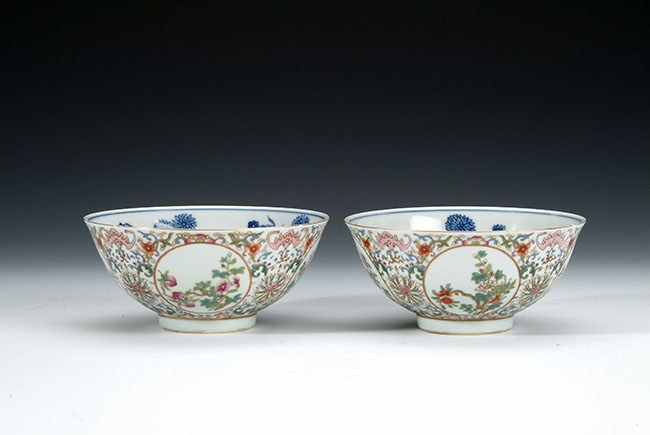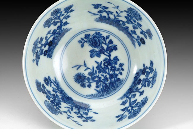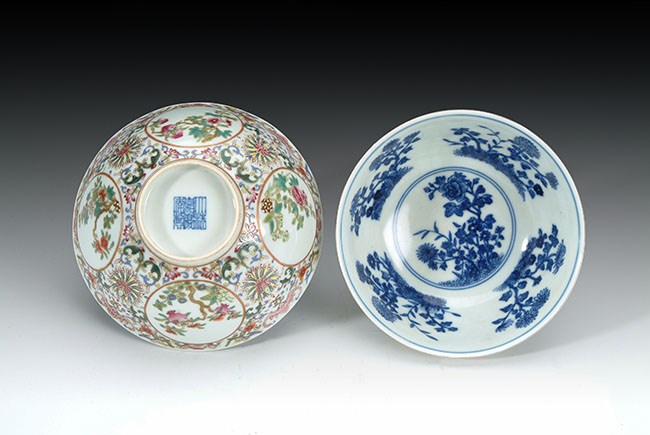 The blue porcelain bowls depicts several flower scenes on the inside. The outside of the bowl is decorated with red flowers and green vines. Chinese marking can be found on the bottom. H: 2 3/4 in (7cm), D: 6in (15cm).