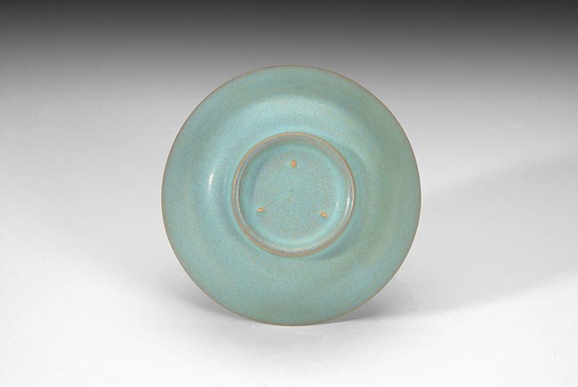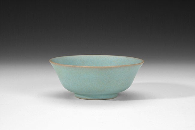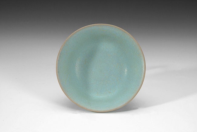 The bowl is of light blue glaze, with crackleware style patterns inside and outside of the bowl. H: 2 in (5cm), D: 5in (13cm).