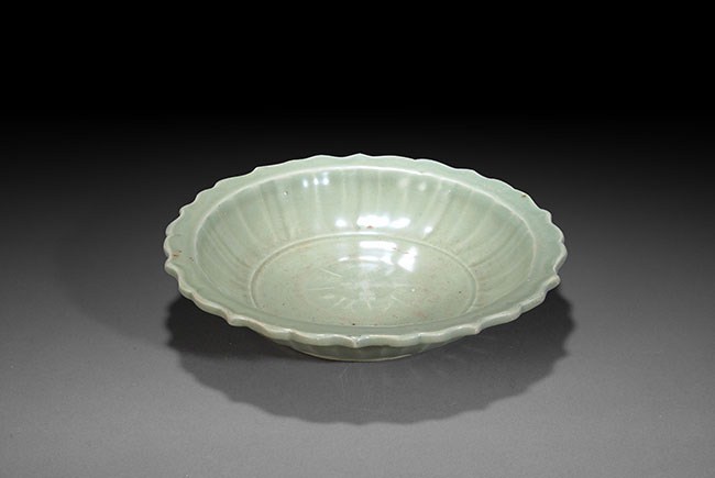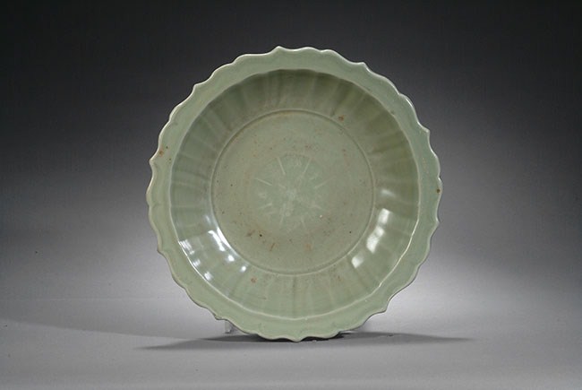 This large sized charger is glazed with typical Song Dynasty celadon color. The foliated rim extends to the interior with concave ridges. The base bears the typical iron red burn mark. Period of Ming Dynasty. H: 2 3/4 in ( 9.5cm), W: 13in ( 33cm).