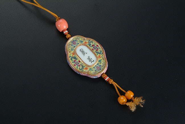The pendant is yellow-green with complicated floral decorations all around. Two Chinese characters are written in the center on both sides of the pendant. L: 2 1/4 in (5.5 cm)