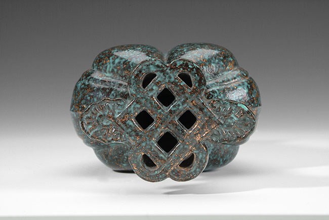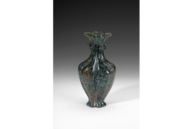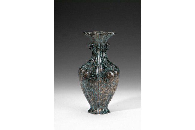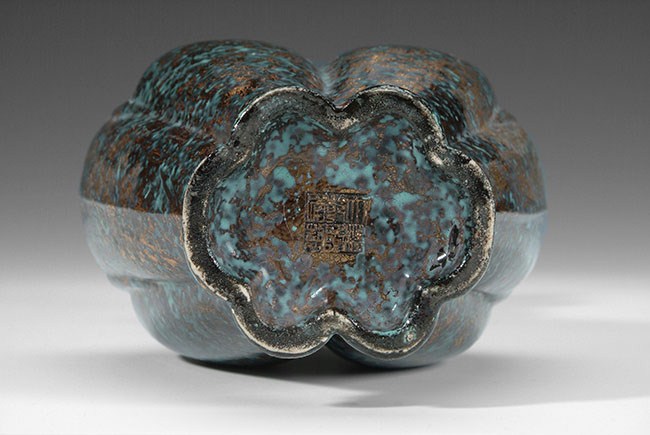 The vase is shaped in a peculiar design, similar to flower petals. Two small Lingzhi handles extrudes from the neck. The opening is spread out, but it is covered by a pierce carved design, allowing very little room. Mark of "QIANLONG" on the bottom. H: 11 in (28 cm)