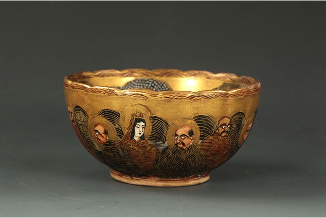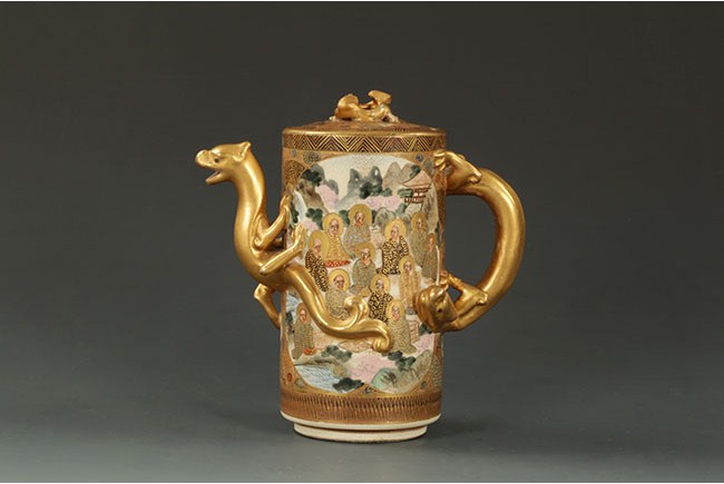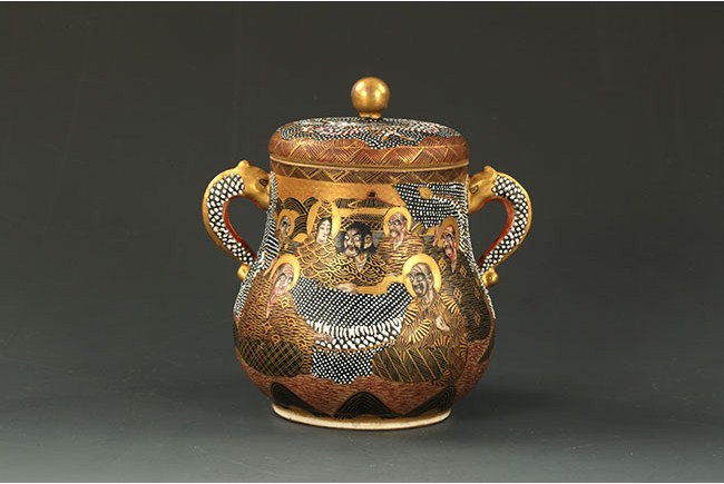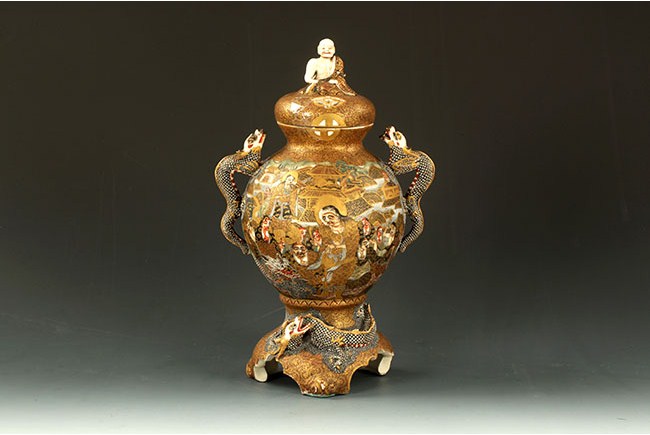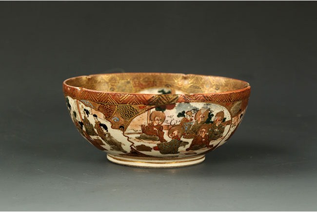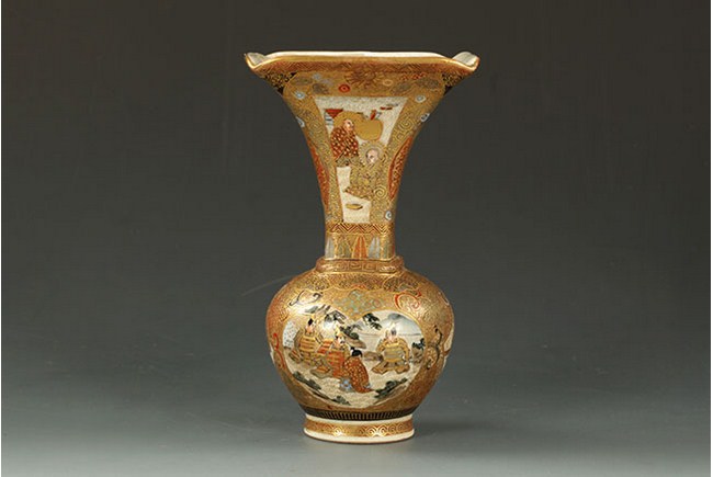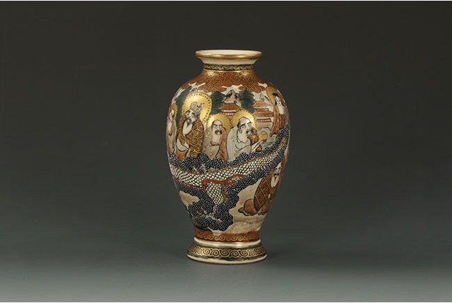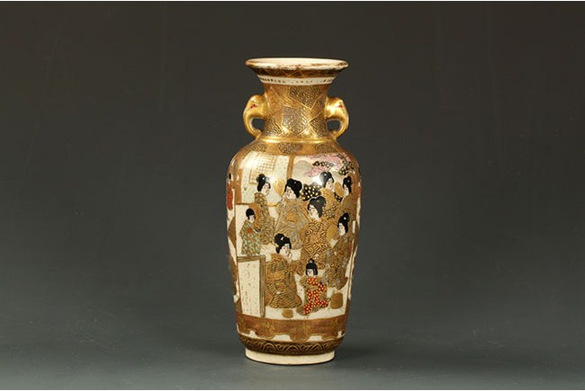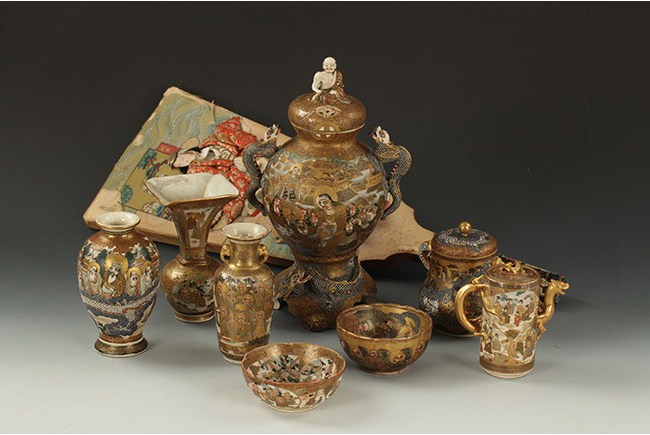 This set of Japanese porcelain consists of matching cups, bowls, vases, and jars, and a paddle. Vase W: 8 in (20cm), H: 12 1/2 in (32cm); Paddle W: 9 in (23cm), H: 24 1/2 in ( 62cm)