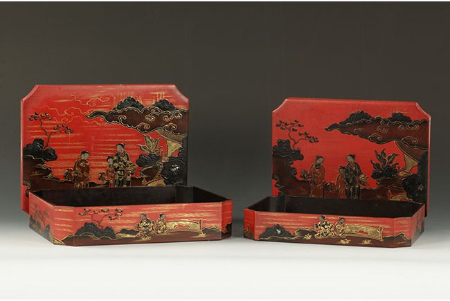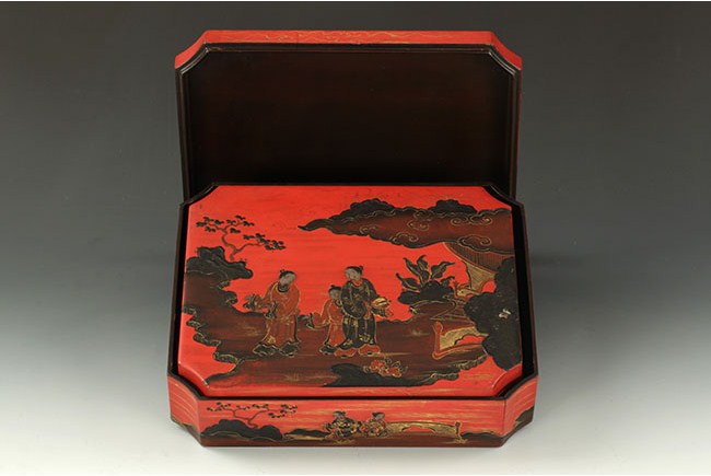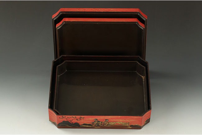 This box consists of a box inside the first box. The boxes are beautifully painted with three figures and a landscape in the background. L: 12 1/2 in (32 cm), W: 10 in (26 cm)