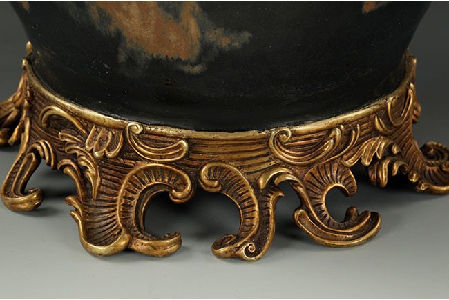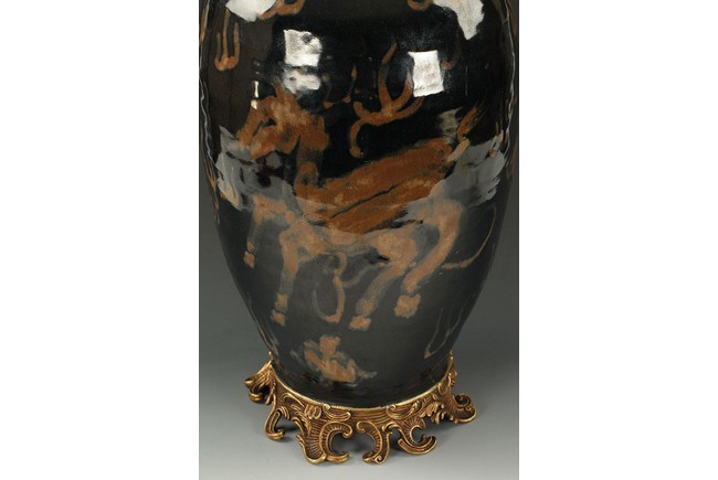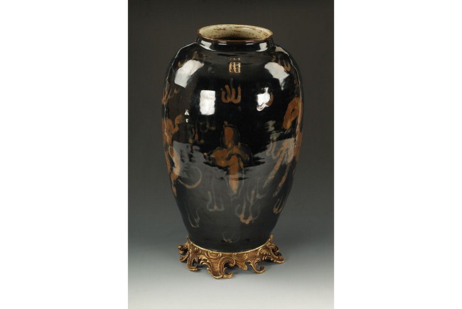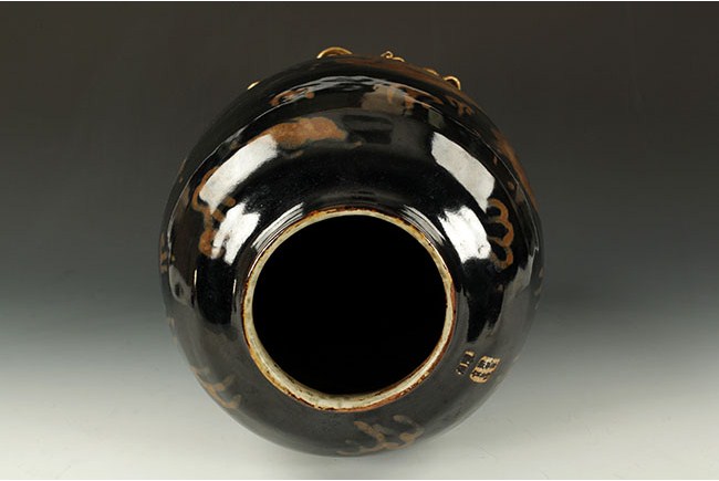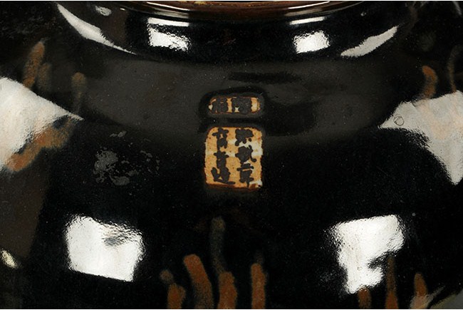 This huge and well-glazed vase depicts a ferocious dragon on the front and a Chinese marking on the other side. W: 11 in (28 cm), L: 20 1/2 in (52 cm)