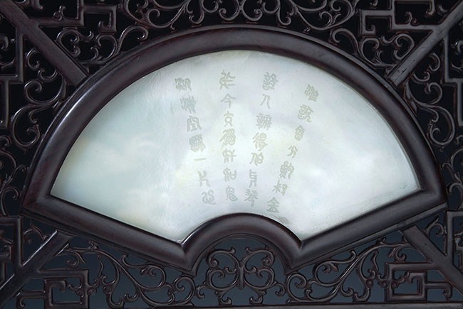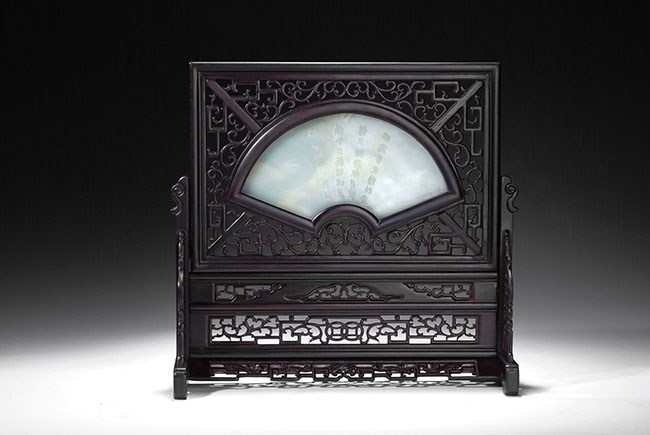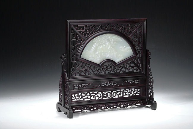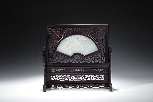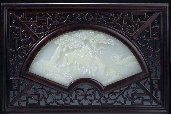 The jade plaque is of fan shape, enclosed by pierce carved hardwood frames. The jade plaque depicts two horses near a river, with poem on the back side. The frame consists of many patterns of flowers, fortune, and longevity. H: 12 1/4 in (31 cm)