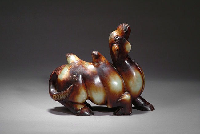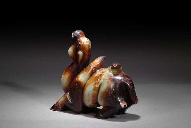 This well carved jade camel is about to rise on its feet. The figure was carved almost life like as you can almost see the movement of the neck, head and the leg of the camel. Hairline crack on the front left leg. H: 9 in ( 23 cm), W: 9 1/2 in ( 24 cm).