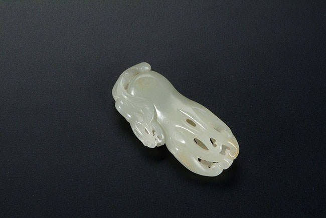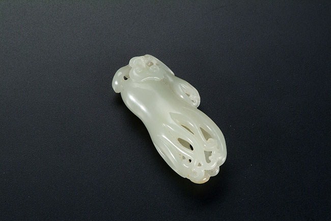 This Buddha"s Hand jade ornament has vines dangling down from its body and leaves on top. Period of Qing Dynasty. L: 2 3/4 in (7.2 cm)