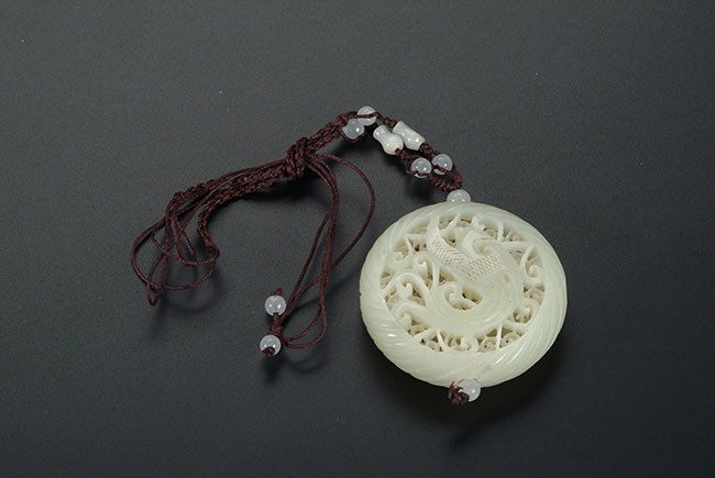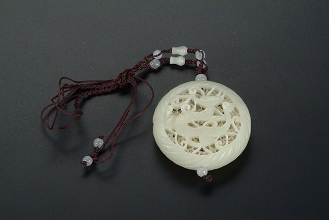 This rounded pierce carved amulet features a phoenix on one side and a dragon on the other. The patterns around the amulet are finely carved and extremely detailed. diameter: 2 1/4 in (5.5 cm)