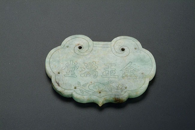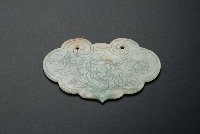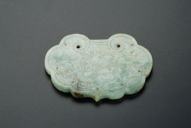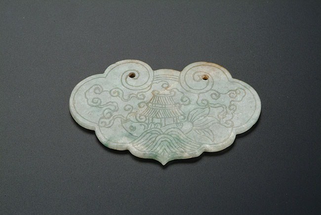 The decorated jade ornaments are in the shape of a cloud and are detailed with a house and garden scenes. Chinese characters are also engraved on one of the item. The smallest ornament is a belt hook that portrays a bat. L: 4 7/8 in (12.5 cm), H: 3 3/4 in (9.5 cm); L: 4 1/2 in (11.5 cm), H: 3 3/8 in (8.5 cm);L: 2 7/8 in (7.3 cm), H: 2 in (5 cm)