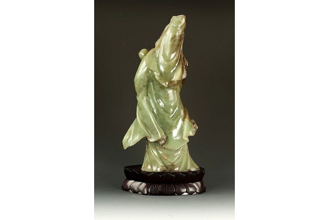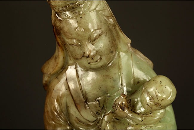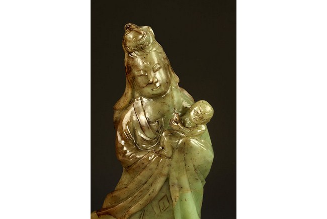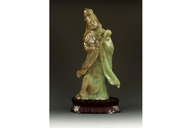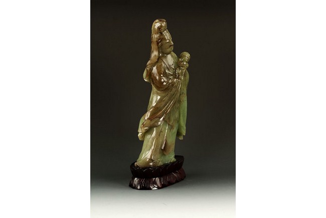 The figure depicts Guanyin holding a young child, symbolizing fertility. H: 18 in (46 cm), W: 8 1/2 in (81.5 cm)