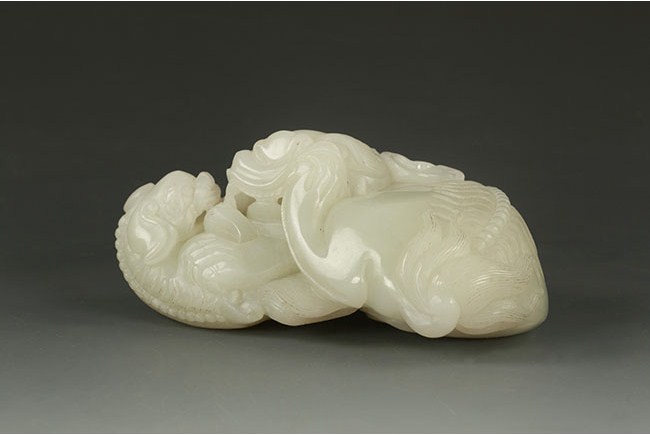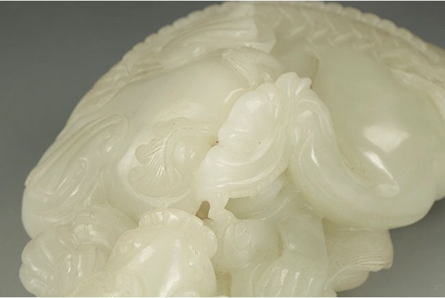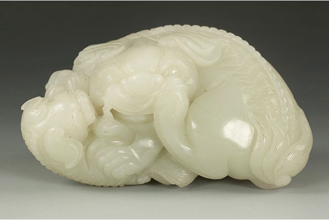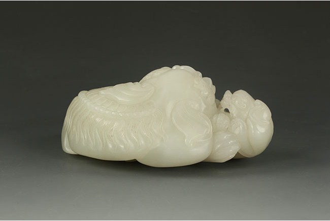 This well-carved jade ornament is made into the form of a fearsome lion, pouncing onto a smaller lion. They show great ferocity. L: 5 1/2 in (14 cm), W: 3 1/2 in (9 cm)