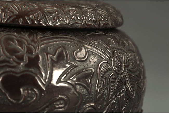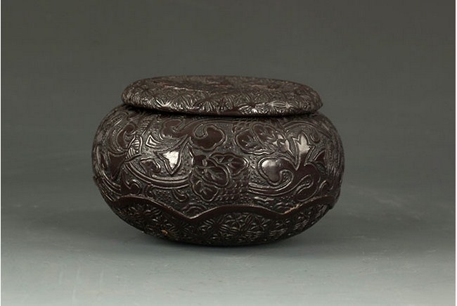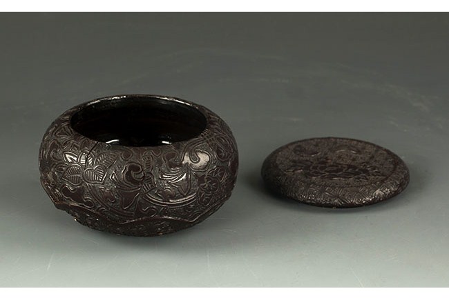 The round box has flower patterns on the bottom and side. On the cover, two butterflies flies around a large flower. Minor chip and crack damage. D: 3 1/4 in (8.3 cm)