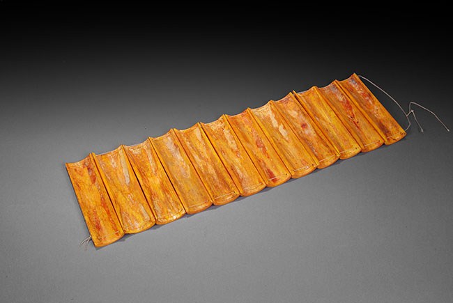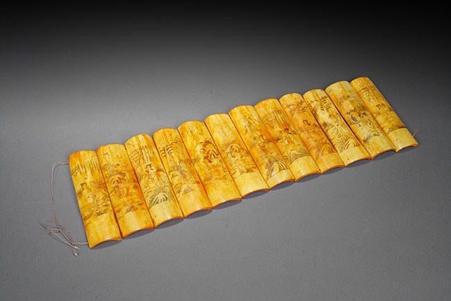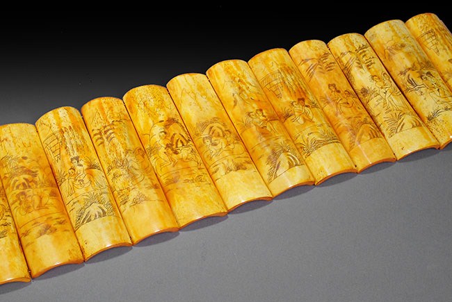 The bamboo scroll consists of twelve separate pieces, strung together by small bands. Each bamboo piece has paintings depicting a different lustful scene. L: 20 1/4 in (51.5 cm), w: 6 in (15.5 cm)