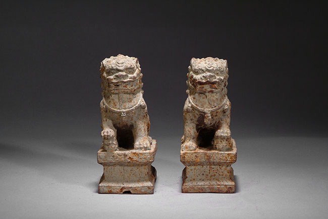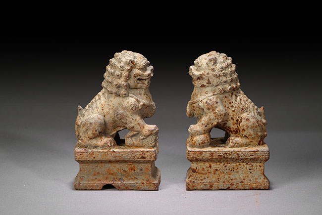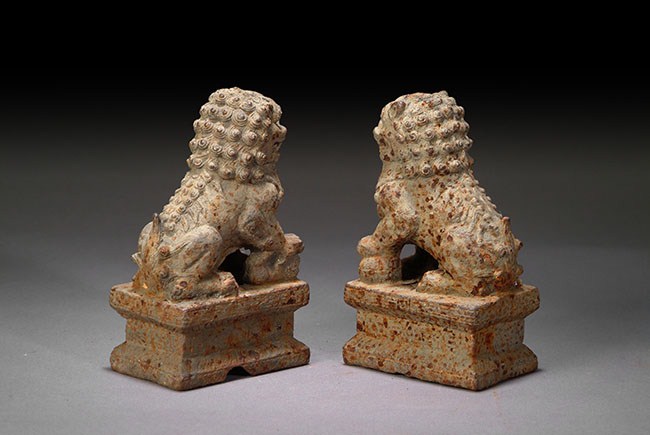 The pair of iron guardian lions symbolizes Yin and Yang. The male guardian lion sets its paws on a ball, signifying world. The female guardian lion sets its paws on the back of a cub. Age related damage and rust. H: 6 1/2 in (17cm)