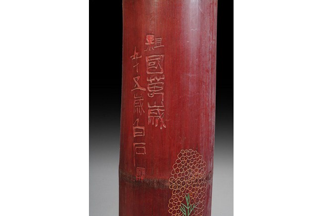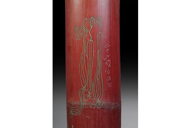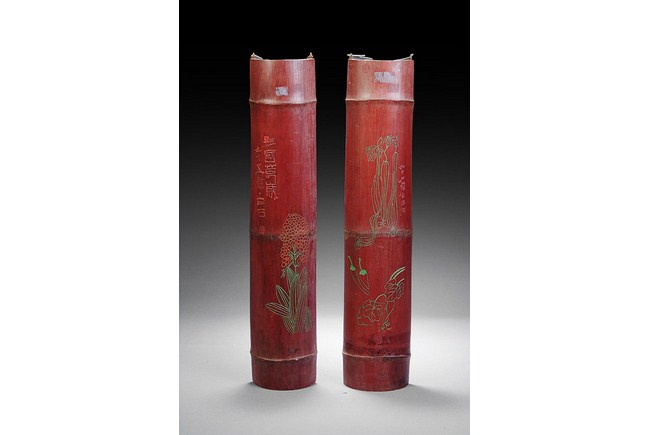 The pair of bamboo features carvings of flowers, fruits, Chinese characters, and artist marks on the side. They were painted with rose red color. H: 24 1/2 in (61.5cm), W: 4 3/4 in (12cm)