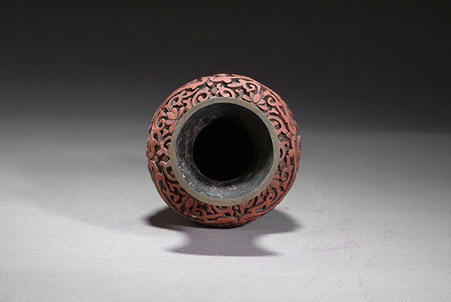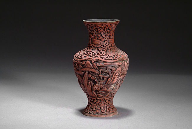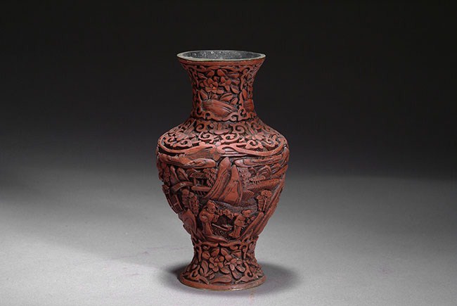 This small sized cinnabar lacquer vase depicts two people meeting in a scene of mountain and river. H: 6 1/2 in (16cm), D: 4 1/2 in (11cm).