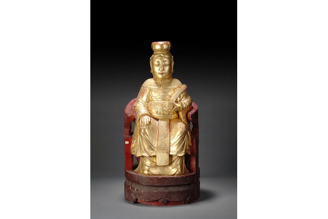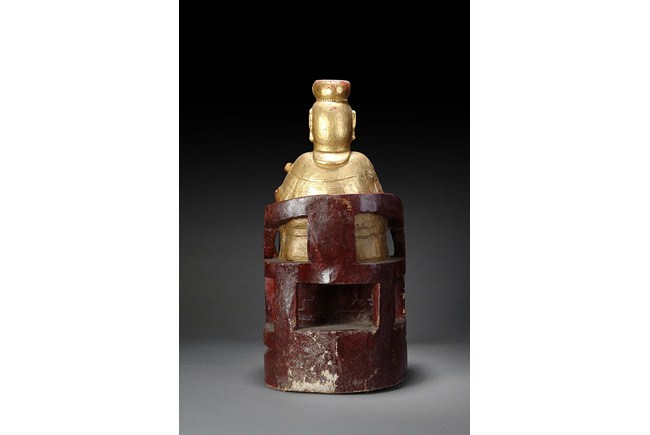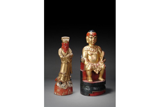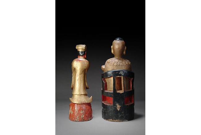 The group of three figures depicts a Prime Minister, a Buddha, and a lady figure. Two figures are seated in chairs, while one figure is standing. H: 19 in ( 48 cm), W: 7 1/2 in ( 19 cm); H: 17 in ( 43 cm), W: 4 1/2 in ( 11 cm); H: 24 in ( 61 cm), W: 12 in ( 30 cm).