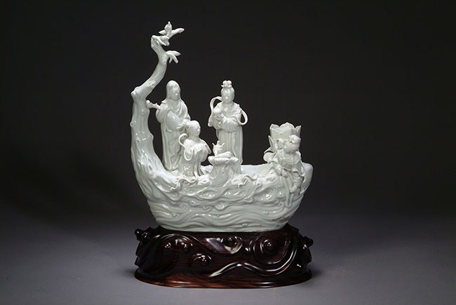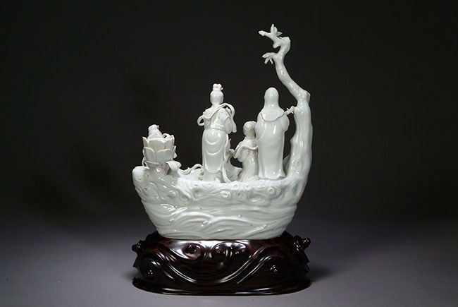 This very beautiful White porcelain artwork is showing the theme of four fairies on the Lotus boat. It pictures the happiness of the four fairies and is extremely detailed. H: 15 in ( 38 cm), W: 11 in ( 28 cm).