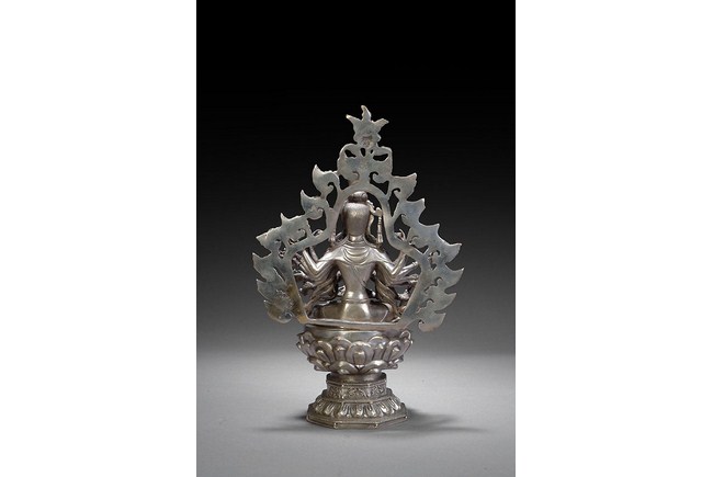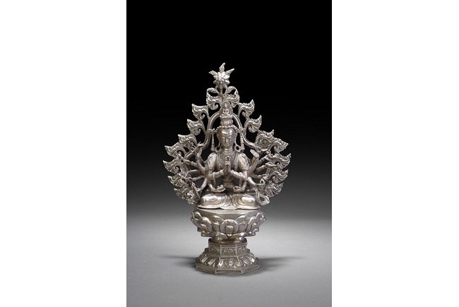 This well casted silver made thousand-hand Bodhisattva sitting on the Lotus throne with a smiling face. In Asian legend, the Bodhisattva is a symbol of love and peace. H: 13 3/4 in ( 35 cm), W: 9 in ( 23 cm).