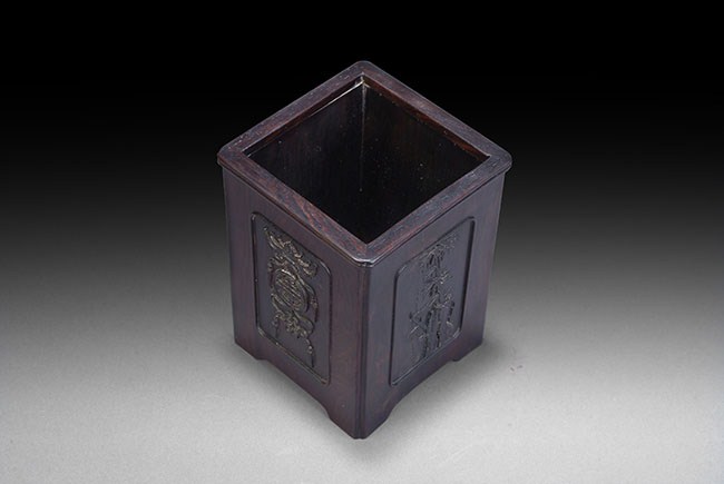 This hardwood brush pot is of rectangular form with square opening, each side carved with shallow relief depicting bamboo, Penjing, and bat symbolizing auspiciousness. H: 5 1/4 in ( 13 cm), W: 4 in ( 10 cm).