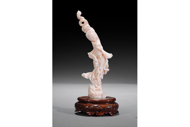 This well made pink color coral beauty is carved in the theme of a graceful dancing lady. The clothes and the face of the lady is highly detailed. H: 7 3/4 in ( 19.5 cm), W: 3 1/4 in ( 8 cm).