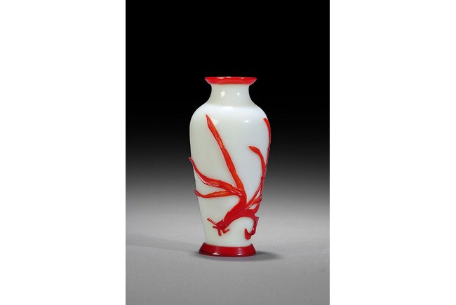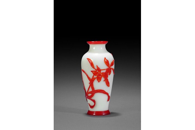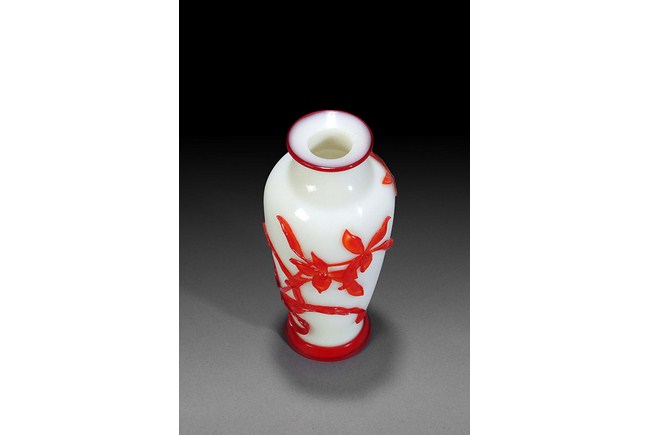 This exquisitely carved overlay glass vase has white background and red accent of an orchid branch. H: 6 1/4 in ( 16 cm), W: 3 in ( 7.5 cm).