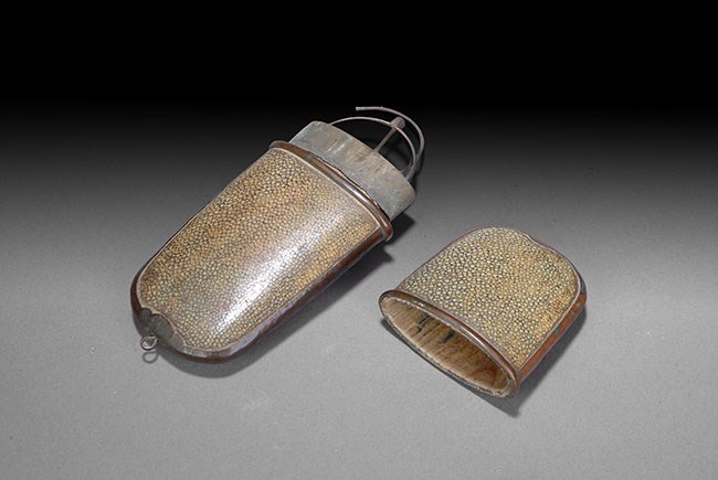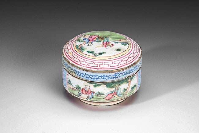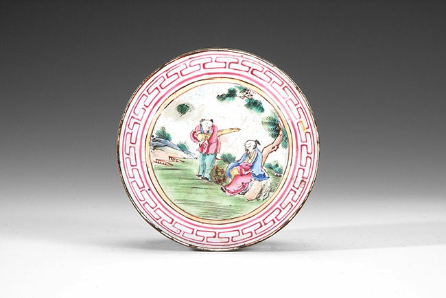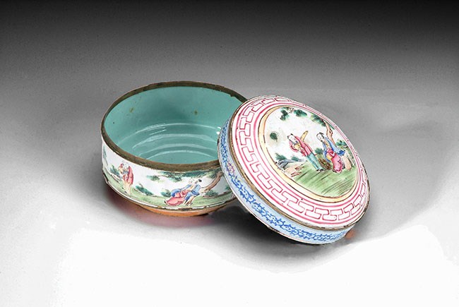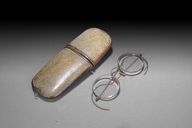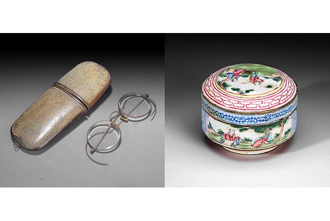 The old eyeglass and its case are still in good condition. The Cantonese enamel box depicts a scholar and his attendant in a scenic setting. L: 5 1/8 in (13cm).