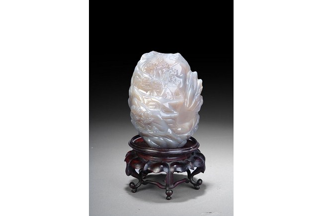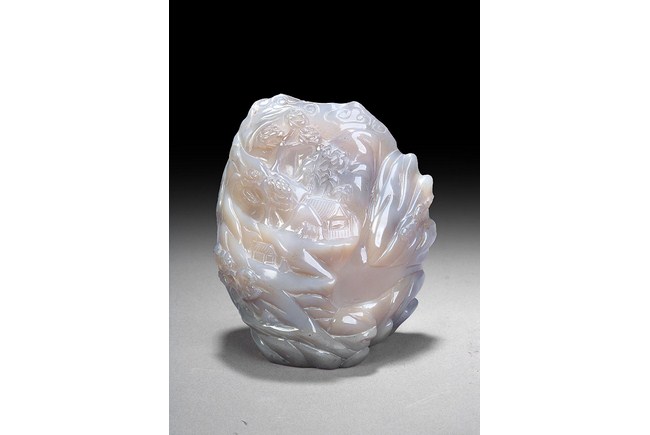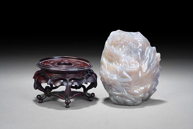 This scholar rock is carved with a theme of a village in the valley, which has a very beautiful scene of waterfall and pine tree. Based on the beautiful color of the stone, this rock is of good ornamental. H: 6 in ( 15.5 cm), D: 5 1/4 in ( 13 cm ).